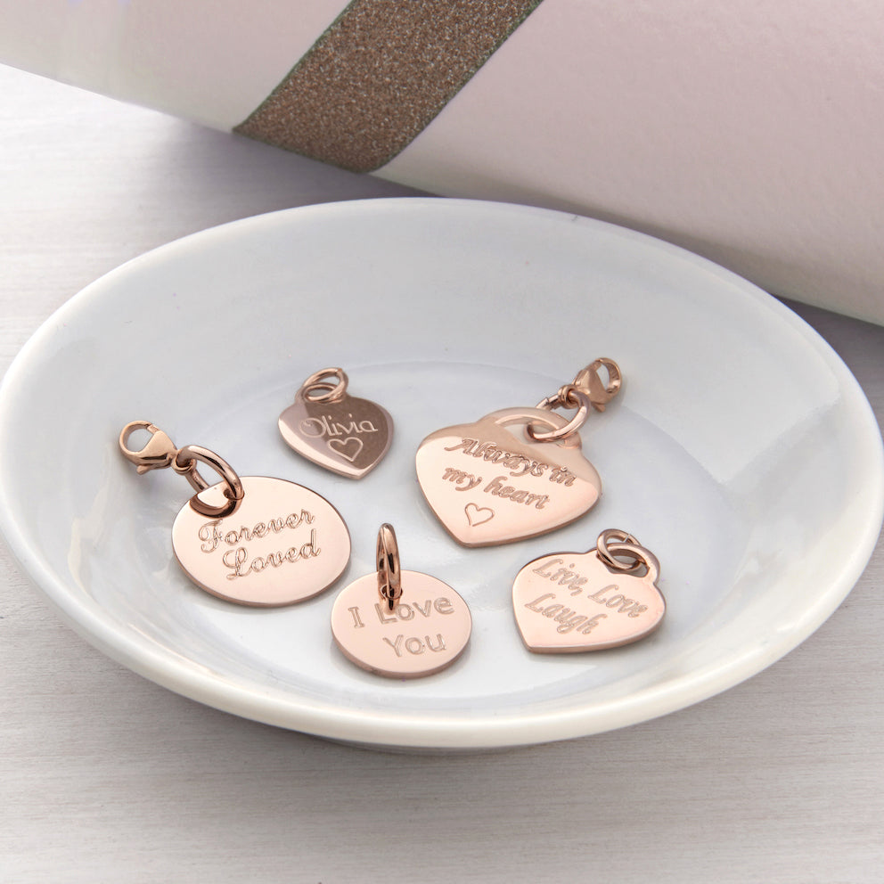 Personalised 18ct Rose Gold Plated Heart And Disc Charms
