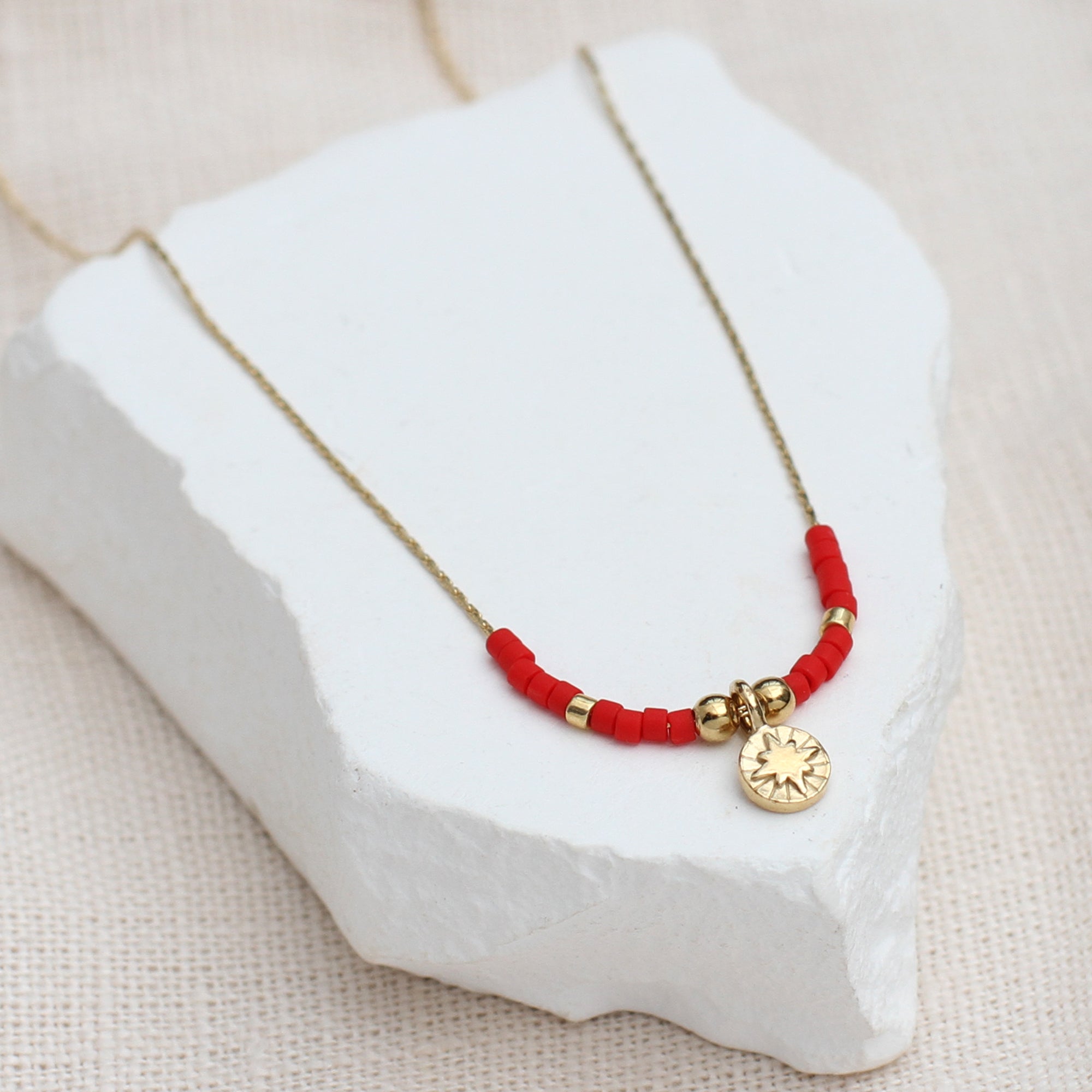 Personalised Gold or Silver Red Beaded Sun Charm Necklace