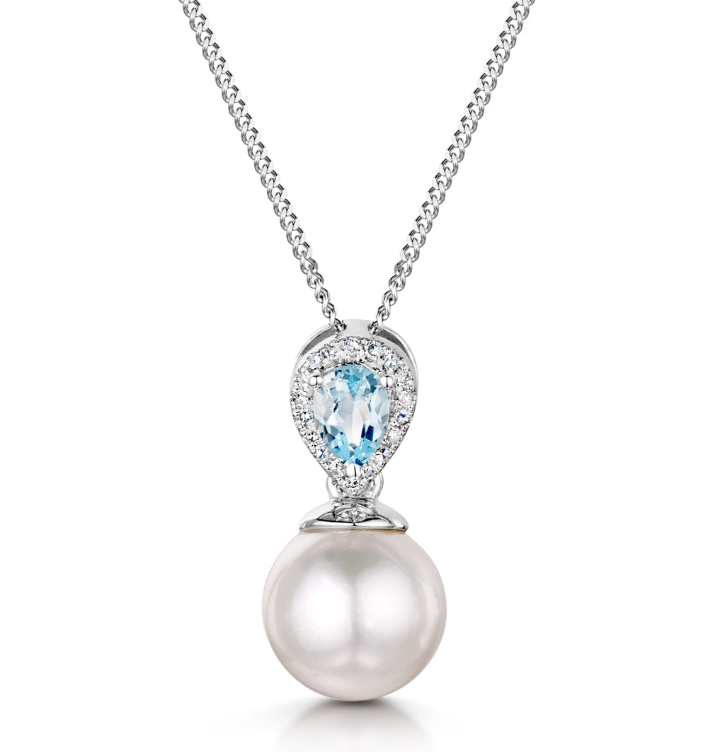 Pearl and Blue Topaz and Diamond Pendant Necklace in 9K White Gold