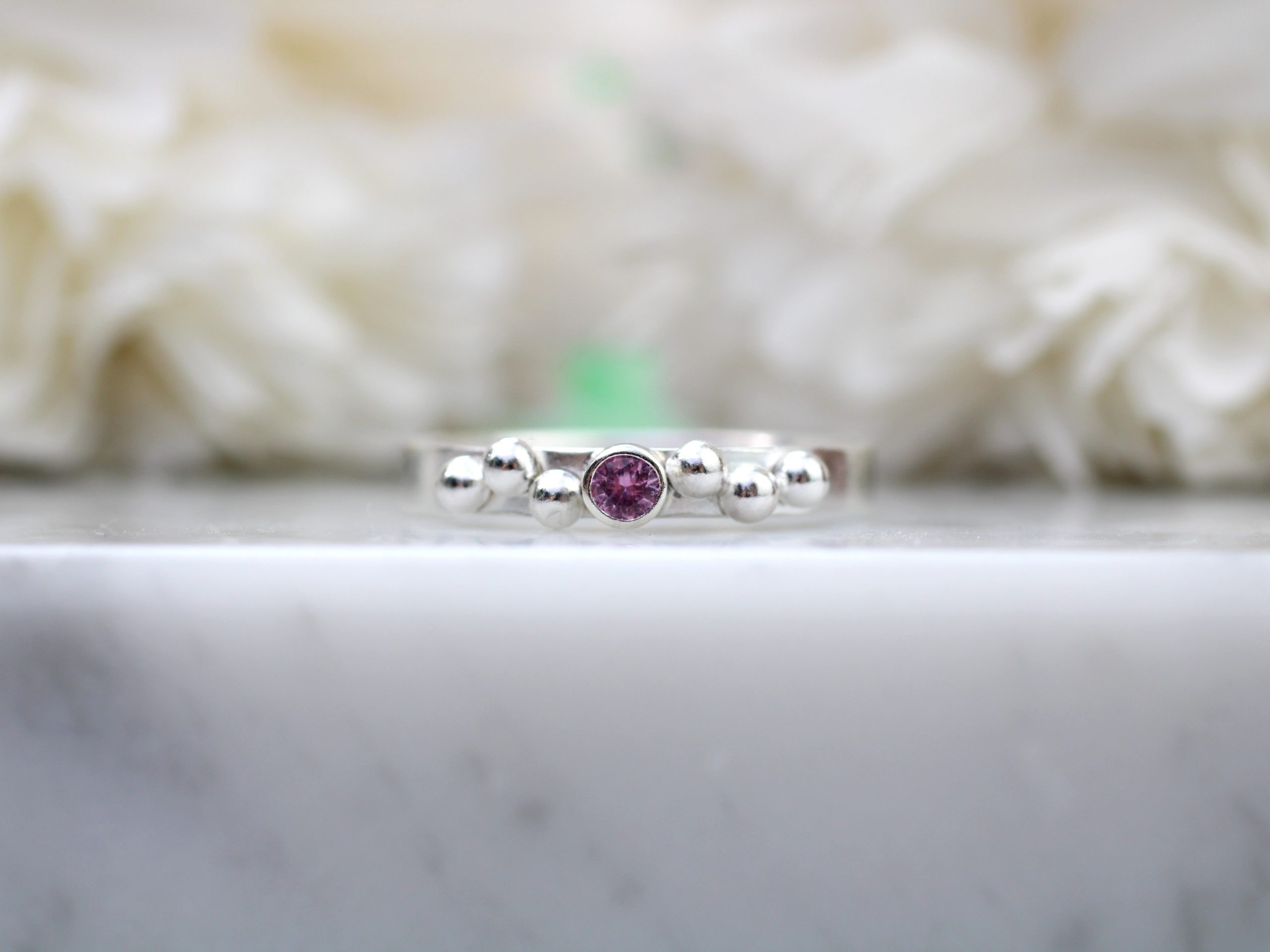 Pink sapphire and granulation ring. September birthstone.