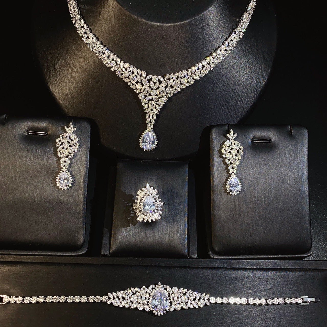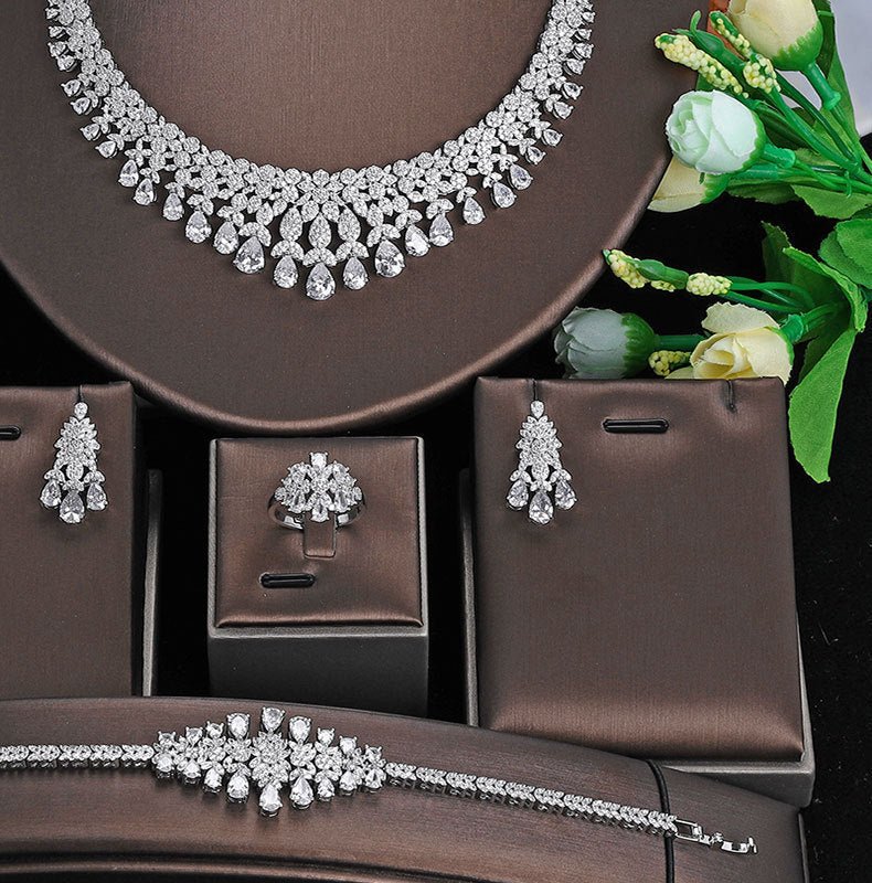 4pcs Diamond Emerald Necklace Earrings Bracelet Ring Set