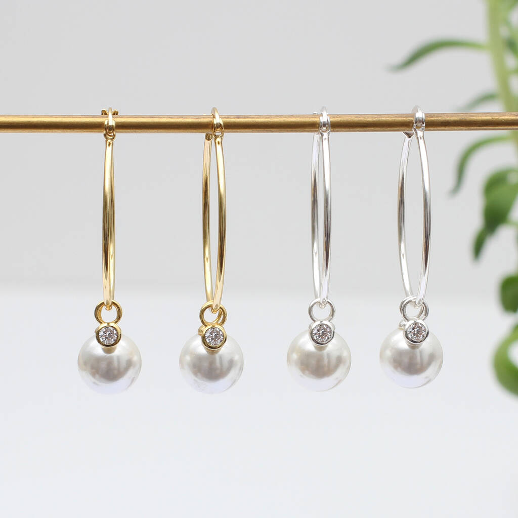 Gold Plated Or Silver And Crystal Pearl Hoop Earrings