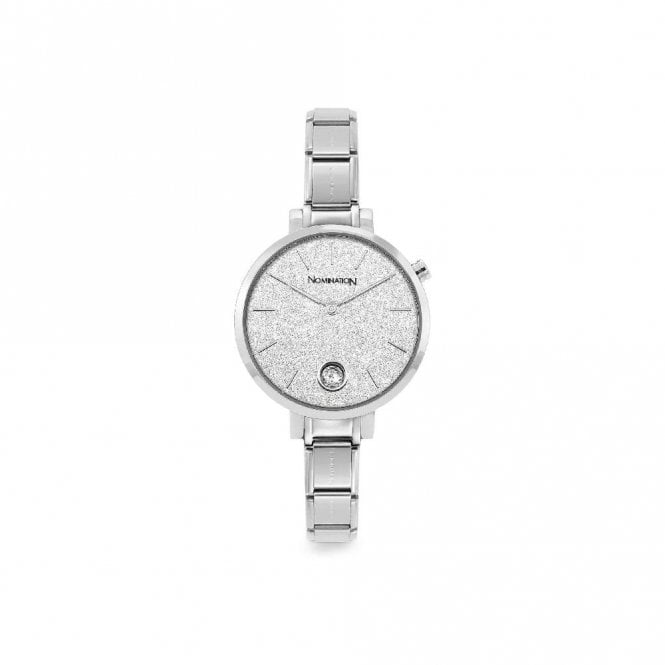 Time Round Silver Glitter Dial & Silver Charm Bracelet Watch with CZ