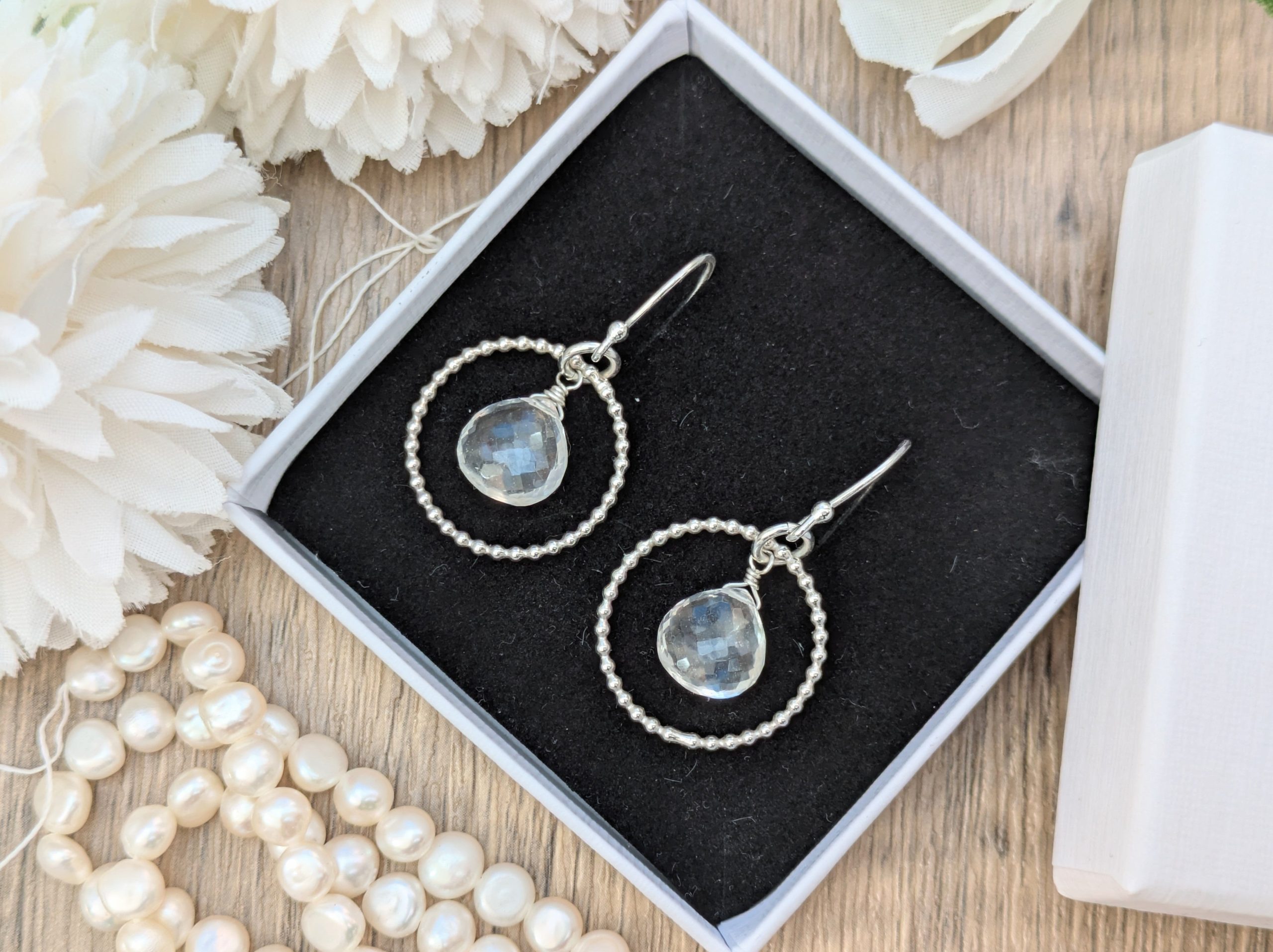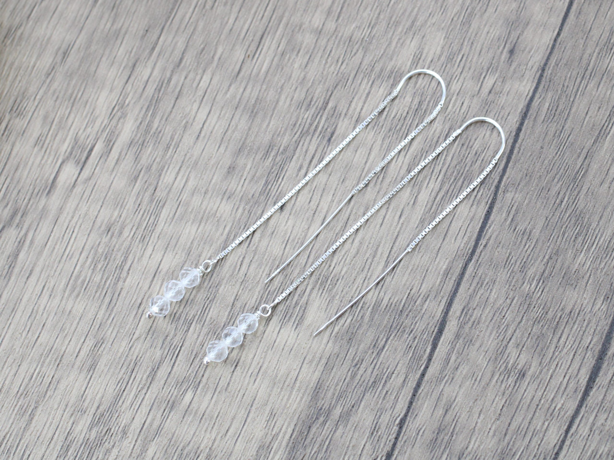 Crystal quartz threader earrings in sterling silver. April birthstone earrings.